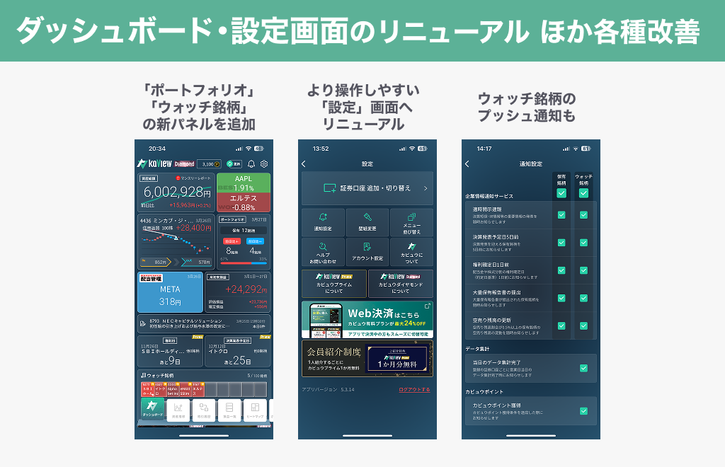 「ポートフォリオ」「ウォッチ銘柄」メニューの追加に伴い、ダッシュボードにも新パネルの追加やデザイン改善を行います。「設定」画面もよりわかりやすく、操作しやすい構成へ変更いたします。 また今回のアップデートに合わせ、「逆日歩」機能は次回リニューアルまで提供を一時停止いたします。
